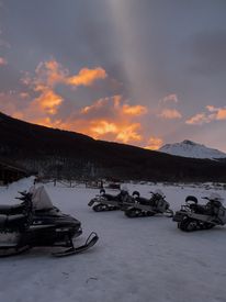 Paseo en moto de nieve al atardecer